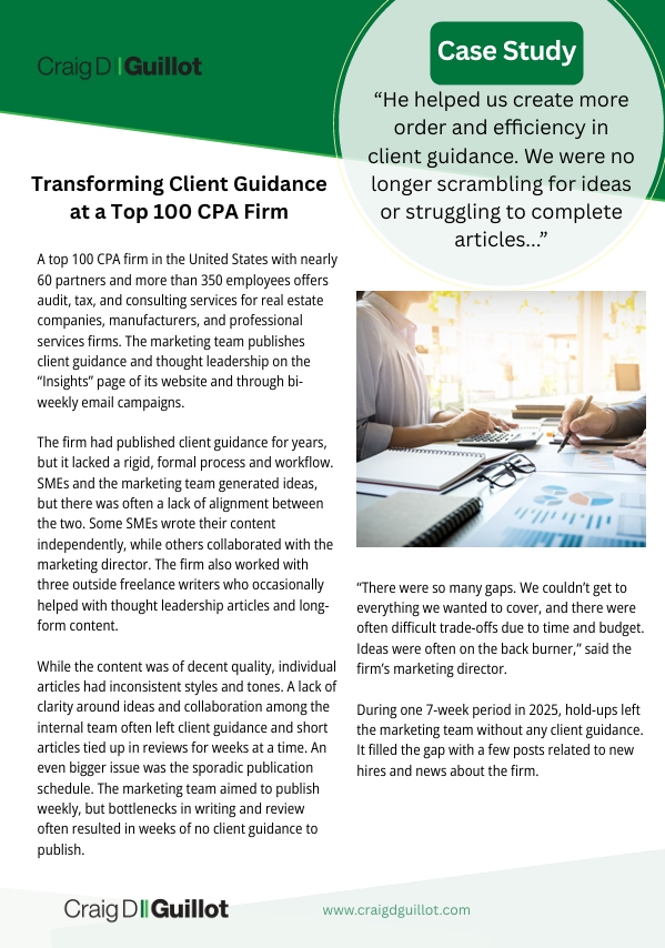 The firm had worked on several thought leadership articles with Craig Guillot over the past couple of years, but learned about his strategy and planning services during a project kick-off call. The marketing team hired him for a custom content planning and roadmapping session.